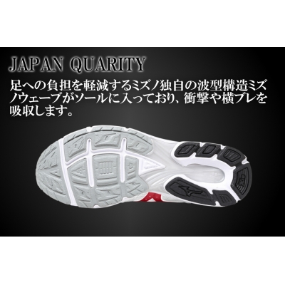 足への負担を軽減するミズノ独自の波型構造ミズノウエーブがソールに入っており、衝撃を分散し、横ブレを抑えます。