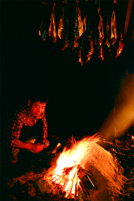 焚火の熱と煙による昔ながらの方法で、北海道のミズナラのおがくずでスモークしてあります。