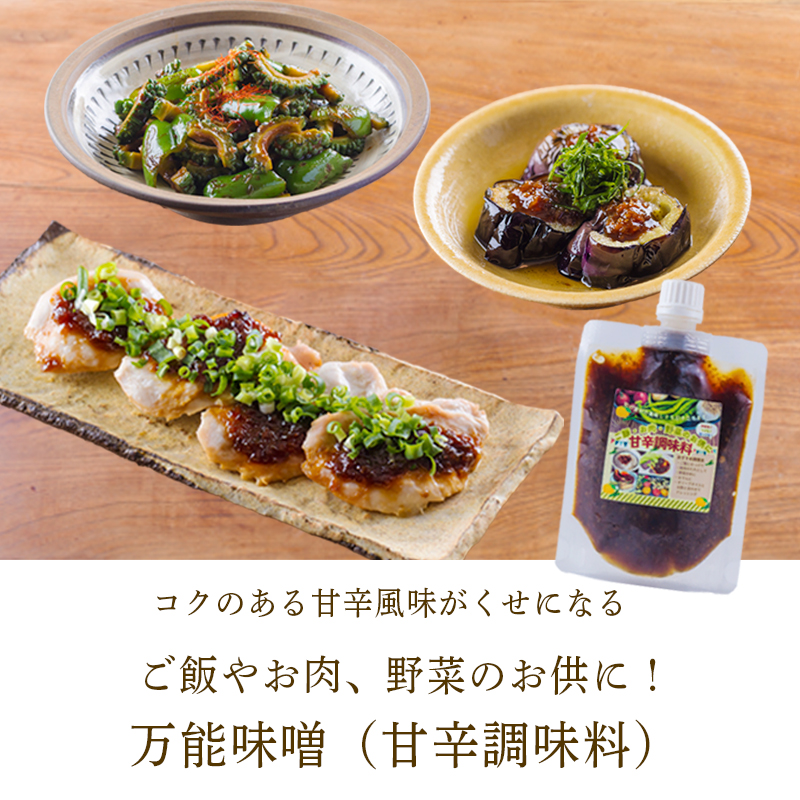 そして、お肉やごはん、うどんにも合う「万能味噌」。地元産の味噌と厳選した調味料を合わせた甘辛風味で、野菜炒めなどはもちろん、おでんや、蒸し物など幅広いレシピで活躍します。