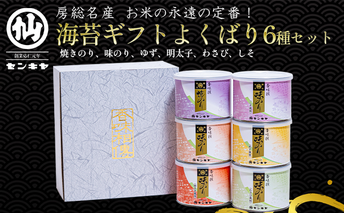 焼きのり、味のり、味のりゆず風味、味のり明太子風味、味のりわさび風味、味のりしそ風味/8切60枚全形7.5(明太子8切52枚全形6.5、わさび8切48枚全形6)各1個ずつ 計6個 化粧箱入り