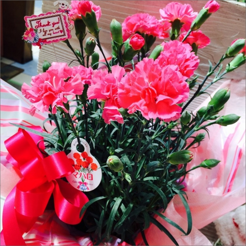カーネーションの鉢を可愛くラッピングしました。母の日の定番ギフトです。