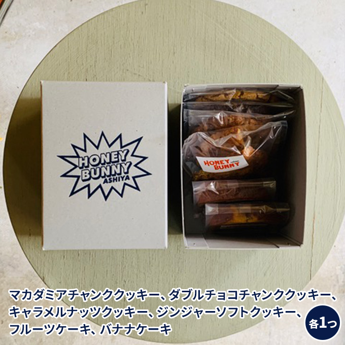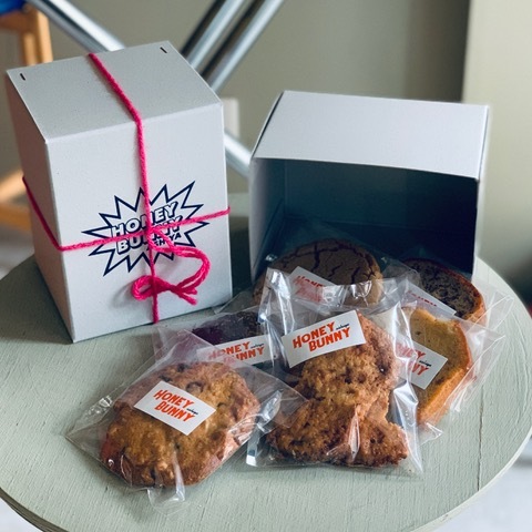 素材選びと手作りにこだわり大判でナッツたっぷりのチャンククッキーや、スパイシーなソフトクッキー、もっちりしっとりのバナナケーキ、フルーツケーキなどをポップなボックスに詰め込んだハニーバニーのギフト。