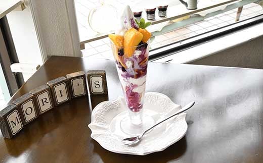 当店カフェメニューで人気の「西都産マンゴーと西都産ブルーベリーのパフェ」カップアイスをぜひお召し上がりください。