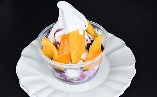 西都産のマンゴーとブルーベリーアイスを一度に楽しめるミニパフェ風のカップアイスです。