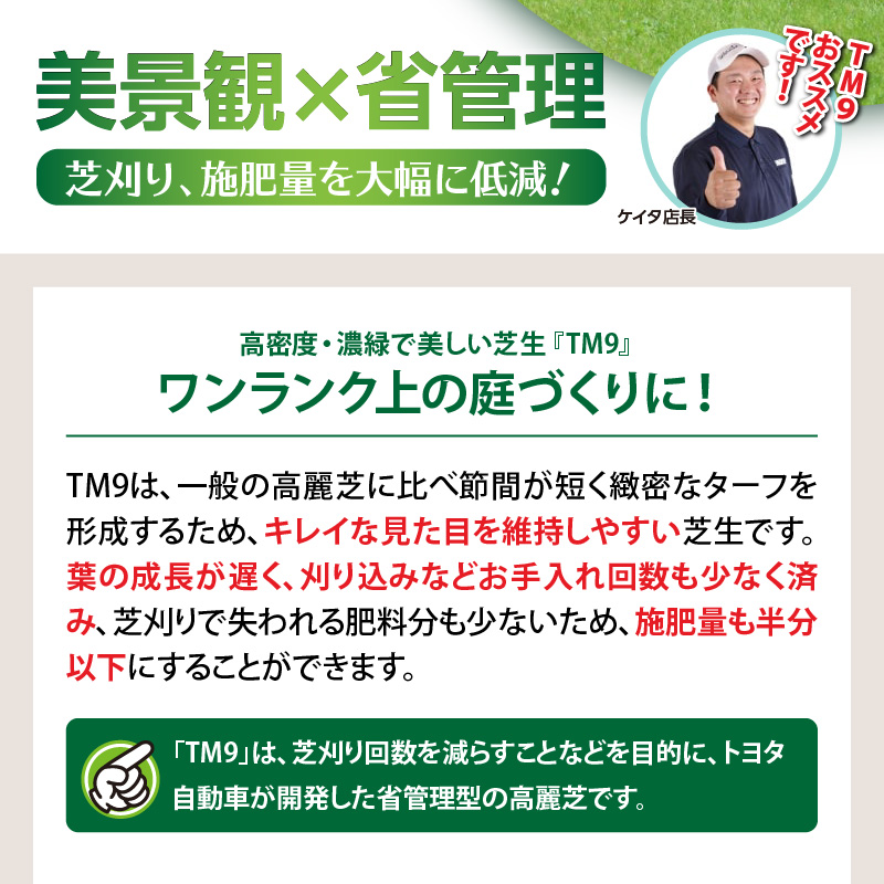 「TM9」は、芝刈り回数を減らすことを目的に、トヨタ自動車(株)が開発した省管理型の高麗芝です。
