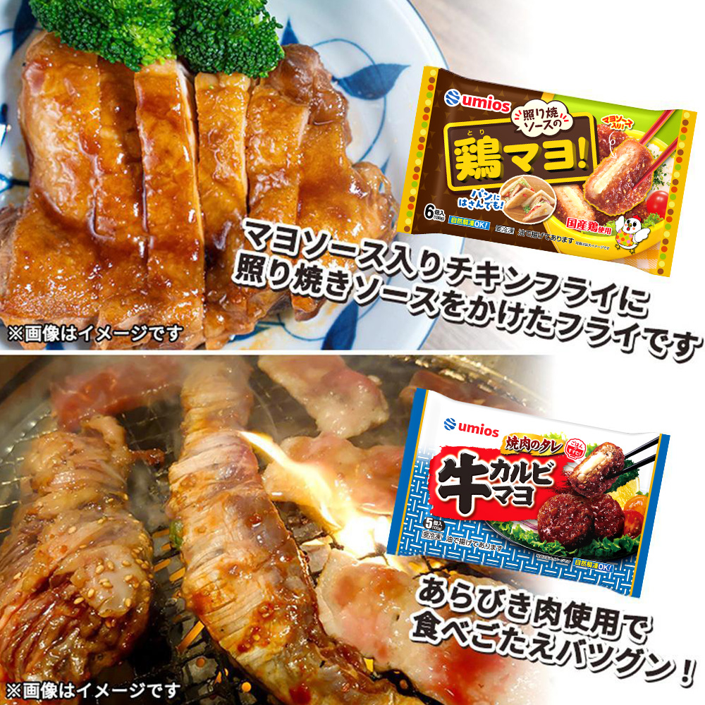 ・照り焼ソースの鶏マヨ!:鶏肉(国産)、半固体状ドレッシング、たまねぎ、豚脂、パン粉、粒状植物性たん白、ゼラチン、しょうゆ、小麦粉、なたね油、砂糖、ビーフ風味調味料、食塩、香辛料、衣(パン粉、いりごま、小麦粉、脱脂大豆粉末、なたね油、米粉、食塩)、照り焼ソース〔糖類(砂糖、ぶどう糖)、しょうゆ、みりん、みそ、ウスターソース、はちみつ、ゼラチン、香辛料、食塩〕、揚げ油(パーム油、なたね油)/加工でん粉、増粘剤(加工でん粉、アルギン酸Na、キサンタン)、トレハロース、調味料(アミノ酸等)、カラメル色素、安定剤(グァー)、pH調整剤、乳化剤、(一部に小麦・卵・乳成分・ごま・大豆・鶏肉・豚肉・ゼラチンを含む)