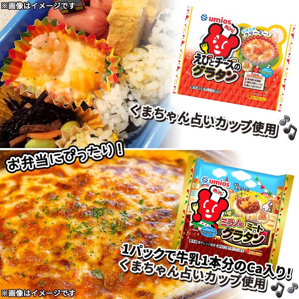・えびとチーズのグラタン:マカロニ(アメリカ製造)、えび、濃縮乳、チーズ、小麦粉、なたね油、乾燥マッシュポテト、食塩、デキストリン、チキンブイヨン、砂糖、香辛料、バター、ソテーオニオン、乳等を主要原料とする食品、ワイン、たん白加水分解物、魚介エキス、しょうゆ、ワイン調製品、寒天、大豆粉、にんにくペースト/増粘剤(加工でん粉、増粘多糖類)、貝Ca、セルロース、調味料(アミノ酸等)、乳化剤、香料、カロチノイド色素、V.D、(一部にえび・かに・小麦・乳成分・大豆・鶏肉・ゼラチンを含む)