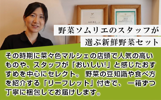 野菜定期便にラインナップする商品は、その時期に菜々色マルシェの店頭に並ぶ商品の中から、特に人気が高いもの、スタッフが実際に食べてみてこれはおいしい!と思ったもの、たくさんの方に知ってもらいたいと思ったものを中心にセレクトしています。