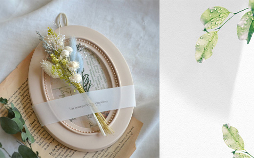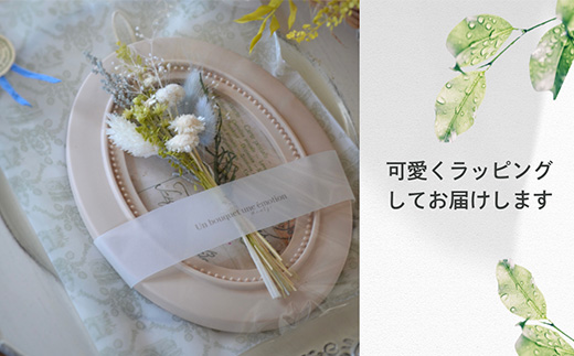 ホワイト、ピンク、グリーンのドライフラワーをふんわりと束ね、フランス語のアンティーク風ペーパーを背景に、優しくエレガントな雰囲気を演出。