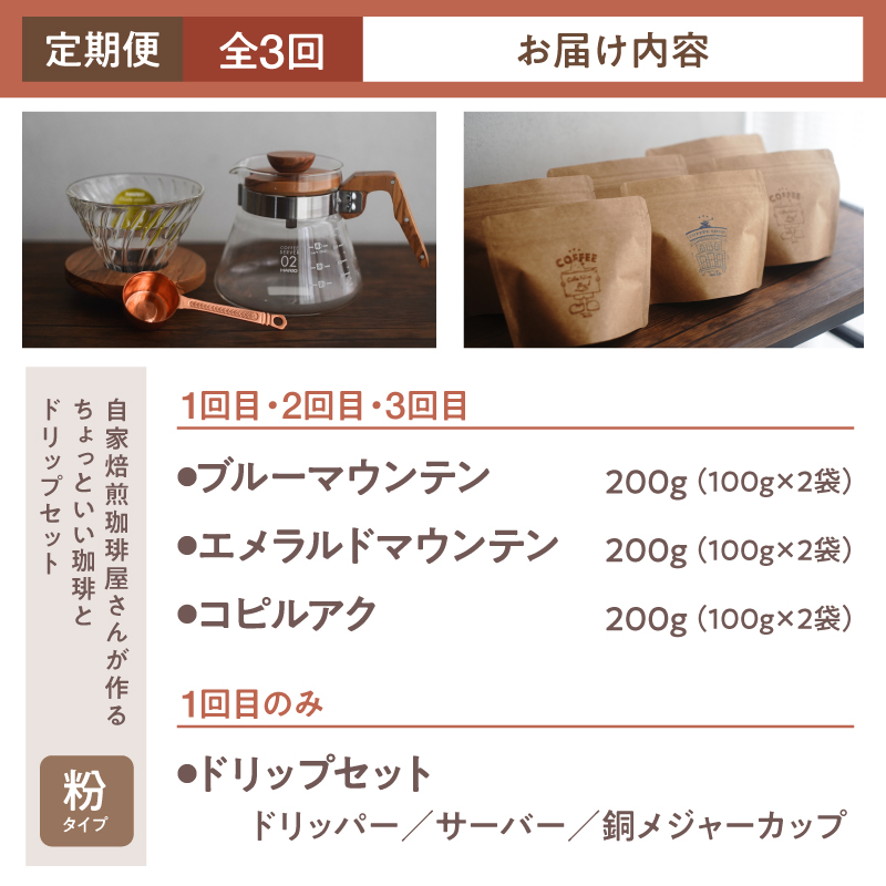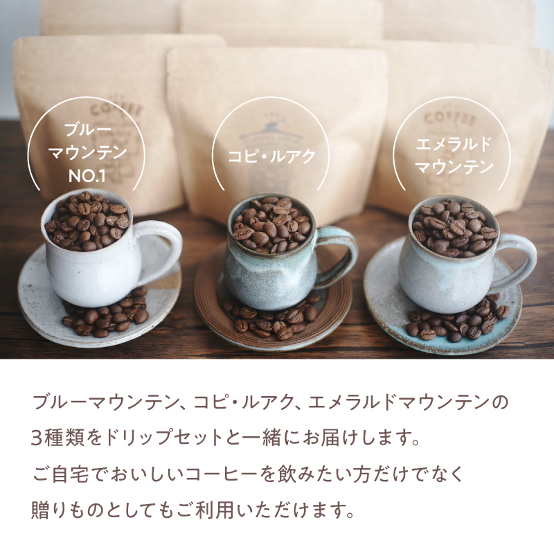 ブルーマウンテン、エメラルドマウンテン、コピルアクの3種類をドリップセットと一緒にお届けしますので、ご自宅でおいしいコーヒーが飲みたい方だけでなく、贈りものとしてもご利用いただけます。