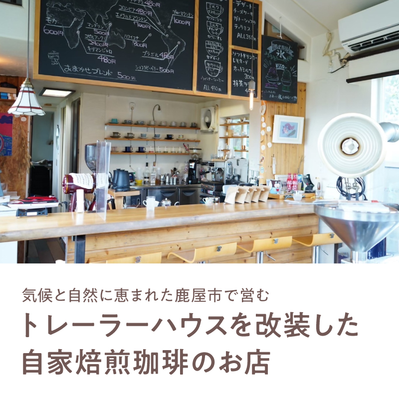 温暖な気候と豊かな自然に恵まれた鹿児島県鹿屋市で、トレーラーハウスを改装した自家焙煎珈琲のお店を営んでいます。