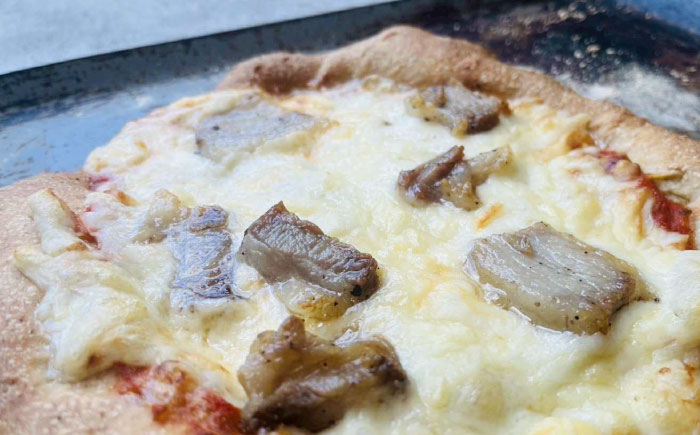市販のベーコンと比べて余計な味がなく、肉本来の旨みがしっかり。ピッツァ全体の味を引き立てています。