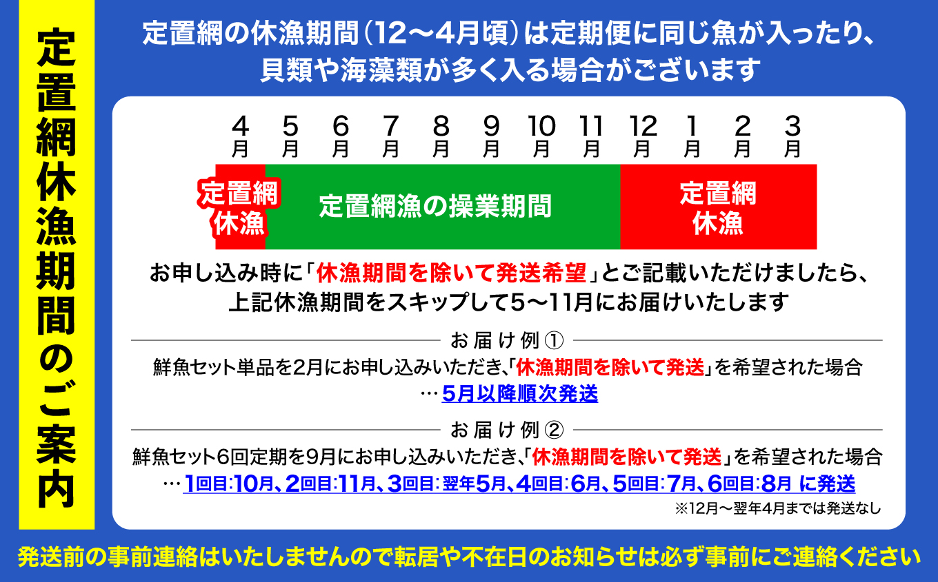 5.定置網の休漁期間(12月~4月頃まで)は、定期便で同じ魚が届く場合がございます。また、貝類や海藻類が多く入る場合もございますのでご了承ください。なお、お申し込み時に「休漁期間を除いて発送希望」とご記載いただけましたら、上記休漁期間をスキップして5月~11月にお届けいたします。