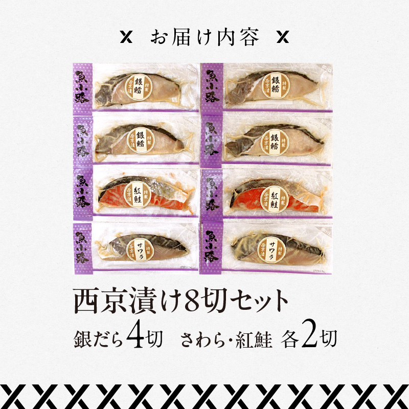 西京漬け8切セット(銀だら4切・さわら2切・紅鮭2切) 計520g