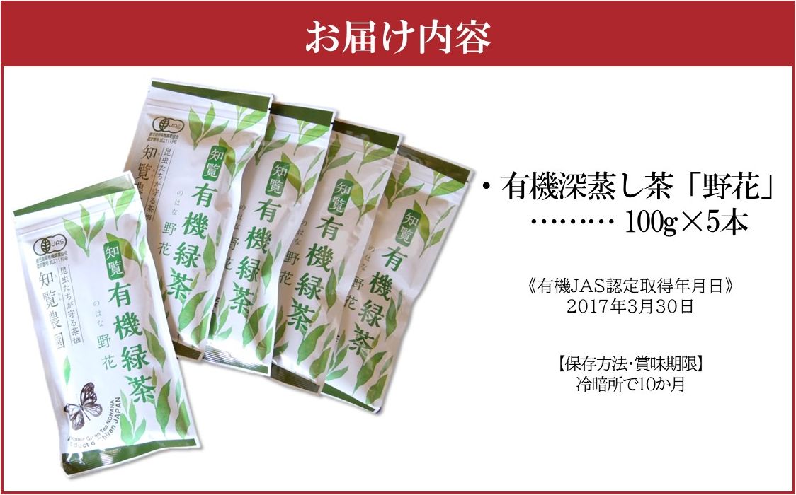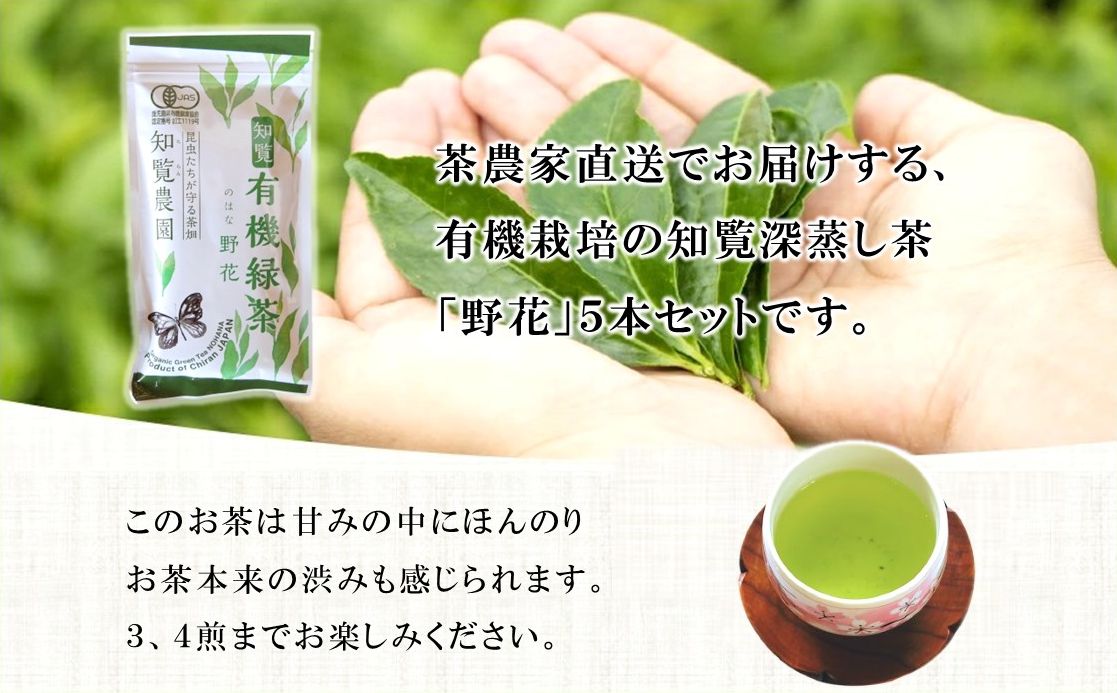 南九州市産有機JAS認定有機深蒸し茶「野花」100g×5本