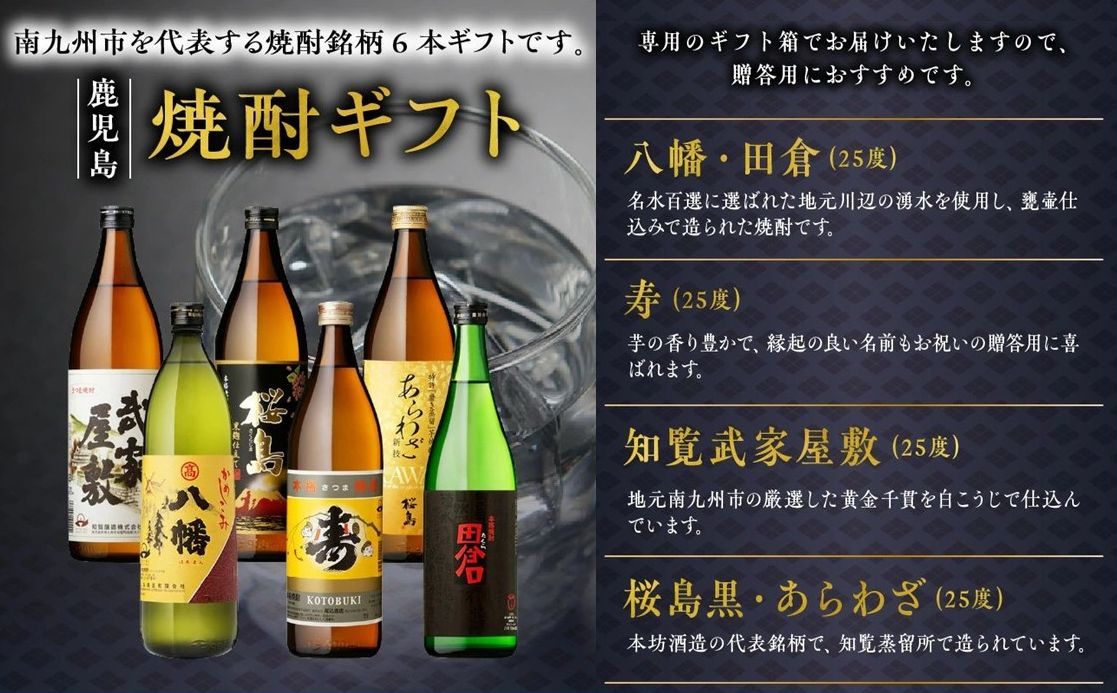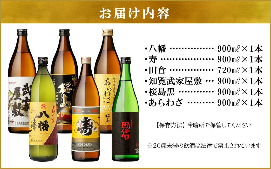 焼酎900ml×5本(八幡、寿、知覧武家屋敷、桜島黒、あらわざ)
