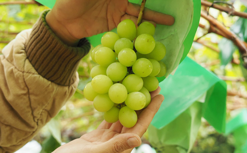 手作業で一房一房育てます。色づきや香り、試食で熟度を確かめながら判断し収穫。