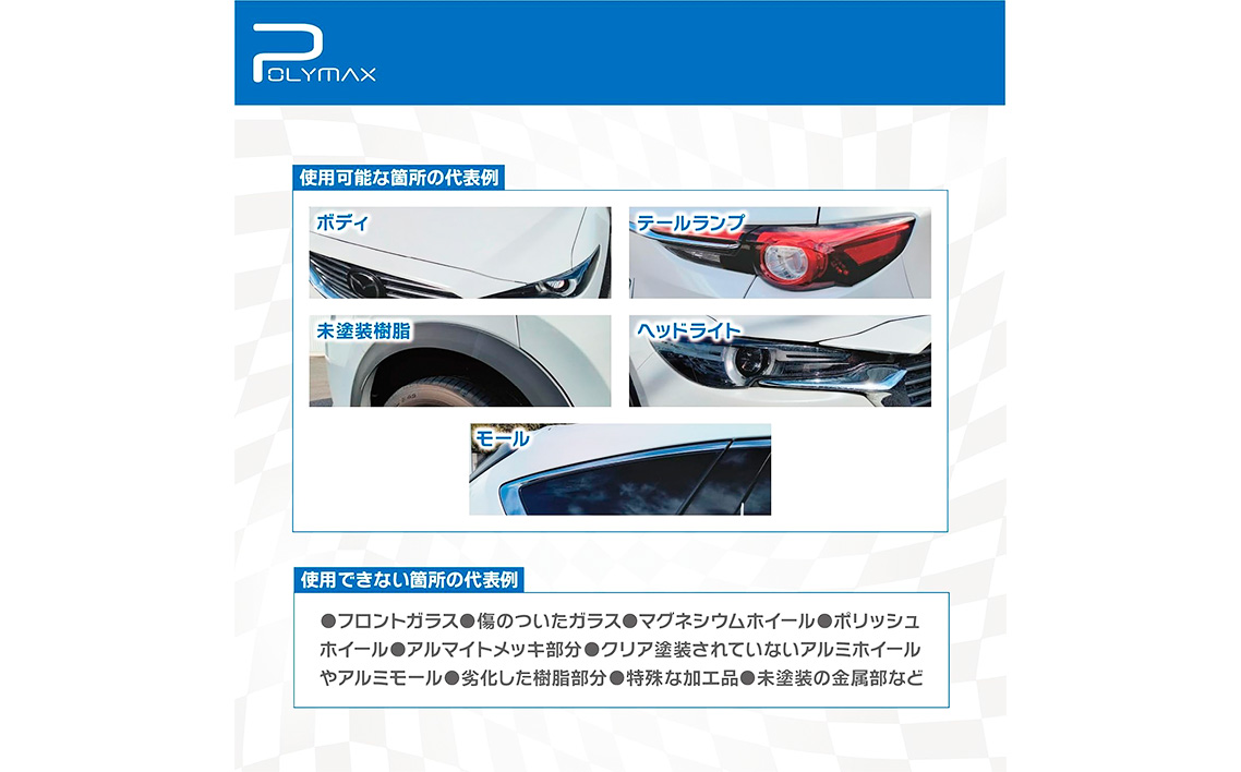 ●使用可能な箇所の代表例:ボディ、テールランプ、未塗装樹脂、ヘッドライト、モール