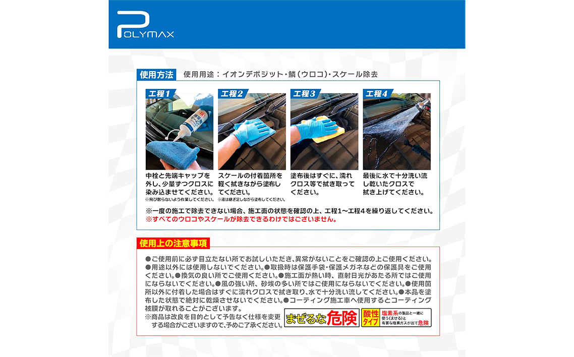 ●水アカ(雨ジミ)、鱗、イオンデポジット、油膜を化学のチカラで簡単除去!