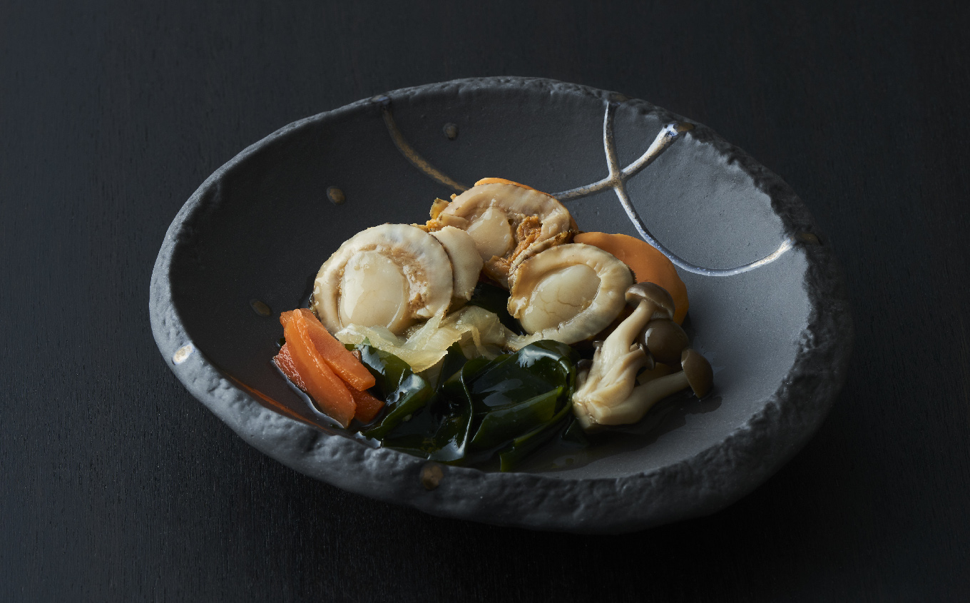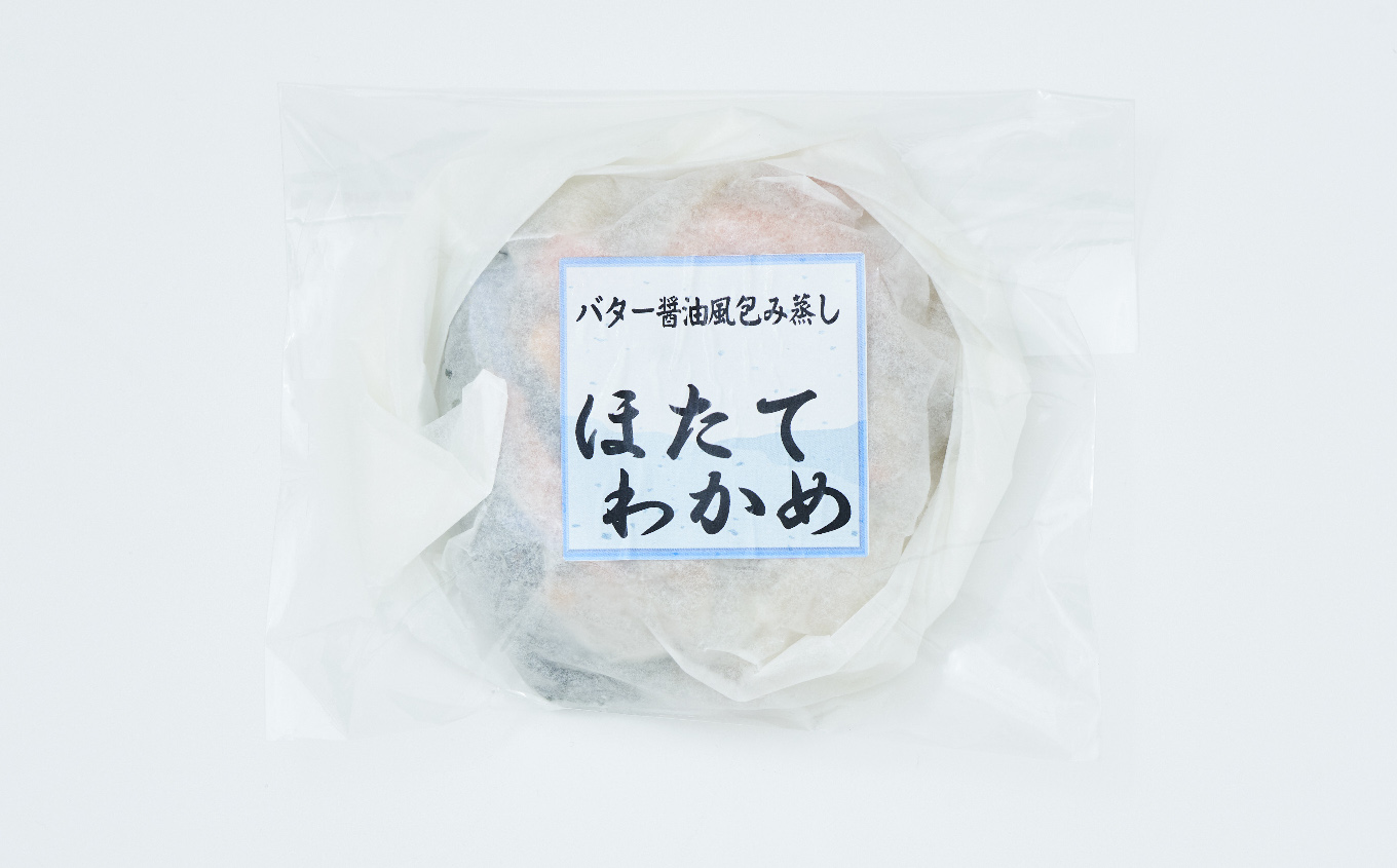 国産のほたてと三陸産のわかめをはじめ、玉ねぎ、しめじ、人参などを、食欲をそそるにんにくバター醤油タレで絡めました。