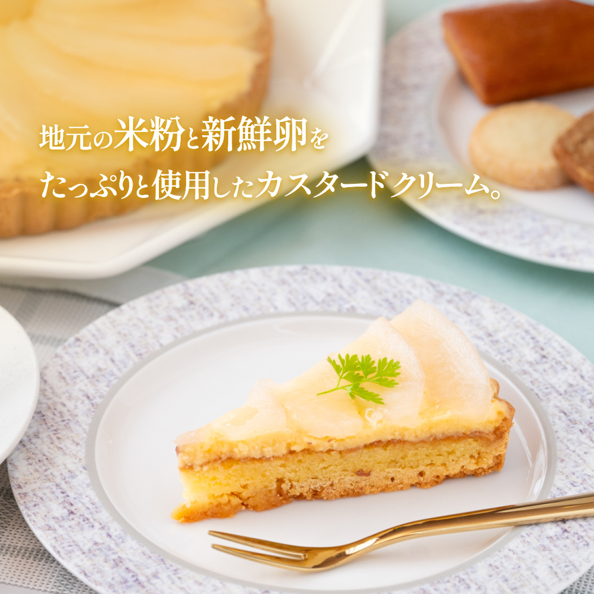 八千代町の自然豊かな果樹園で収穫された梨を、やさしくコンポートにしてタルトに仕上げました。