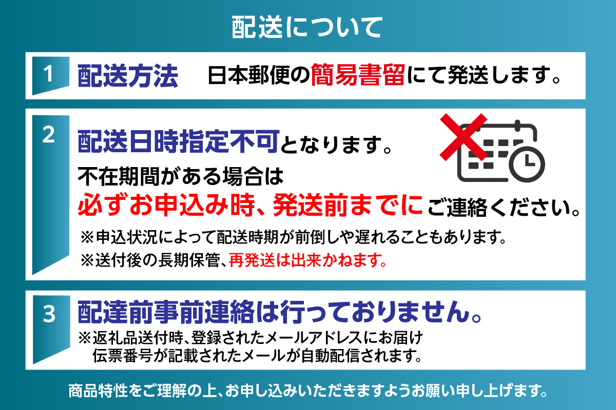 ※お申込み順に順次発送しているため、配送日指定や曜日指定、時間指定、事前連絡のご希望には対応できません。