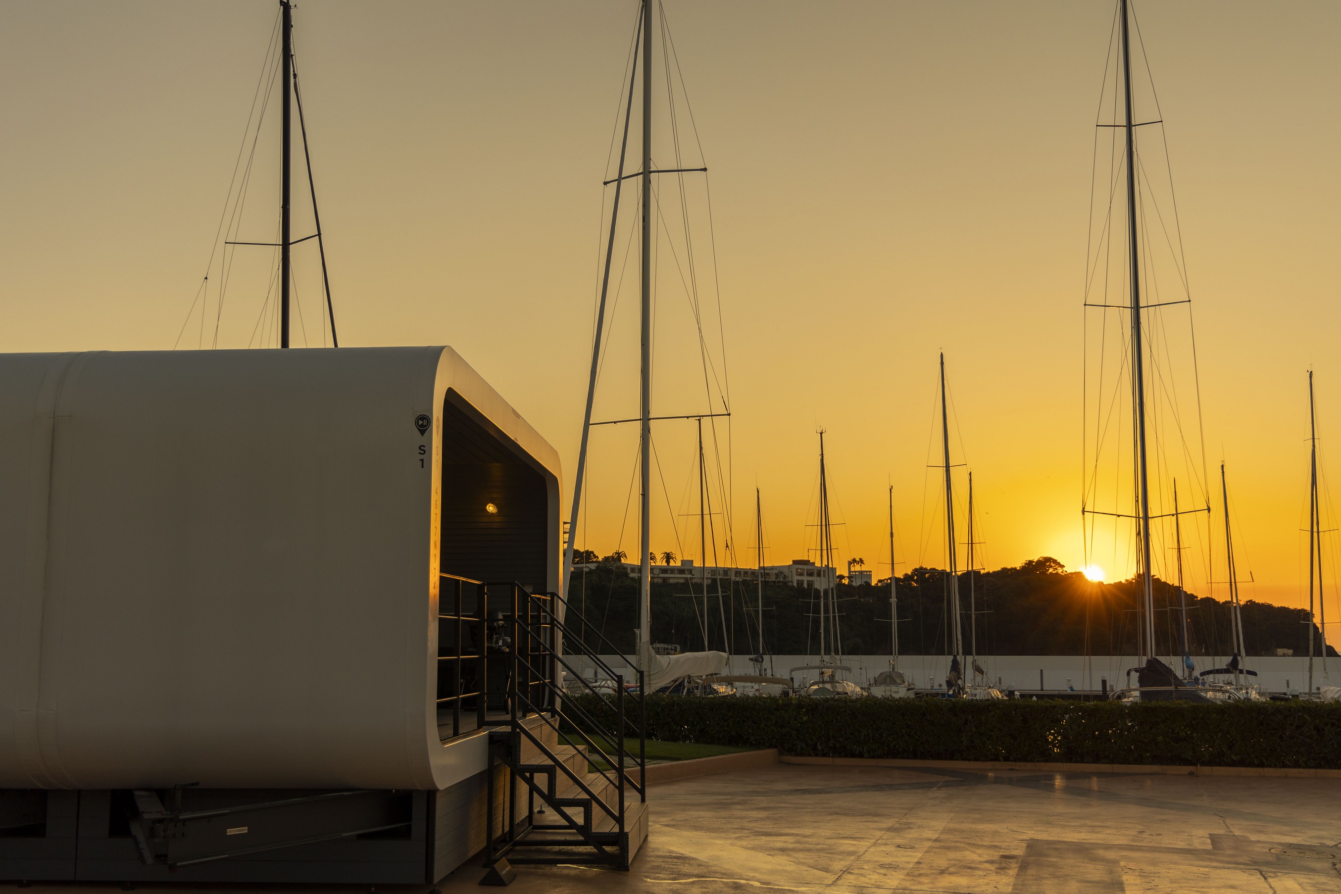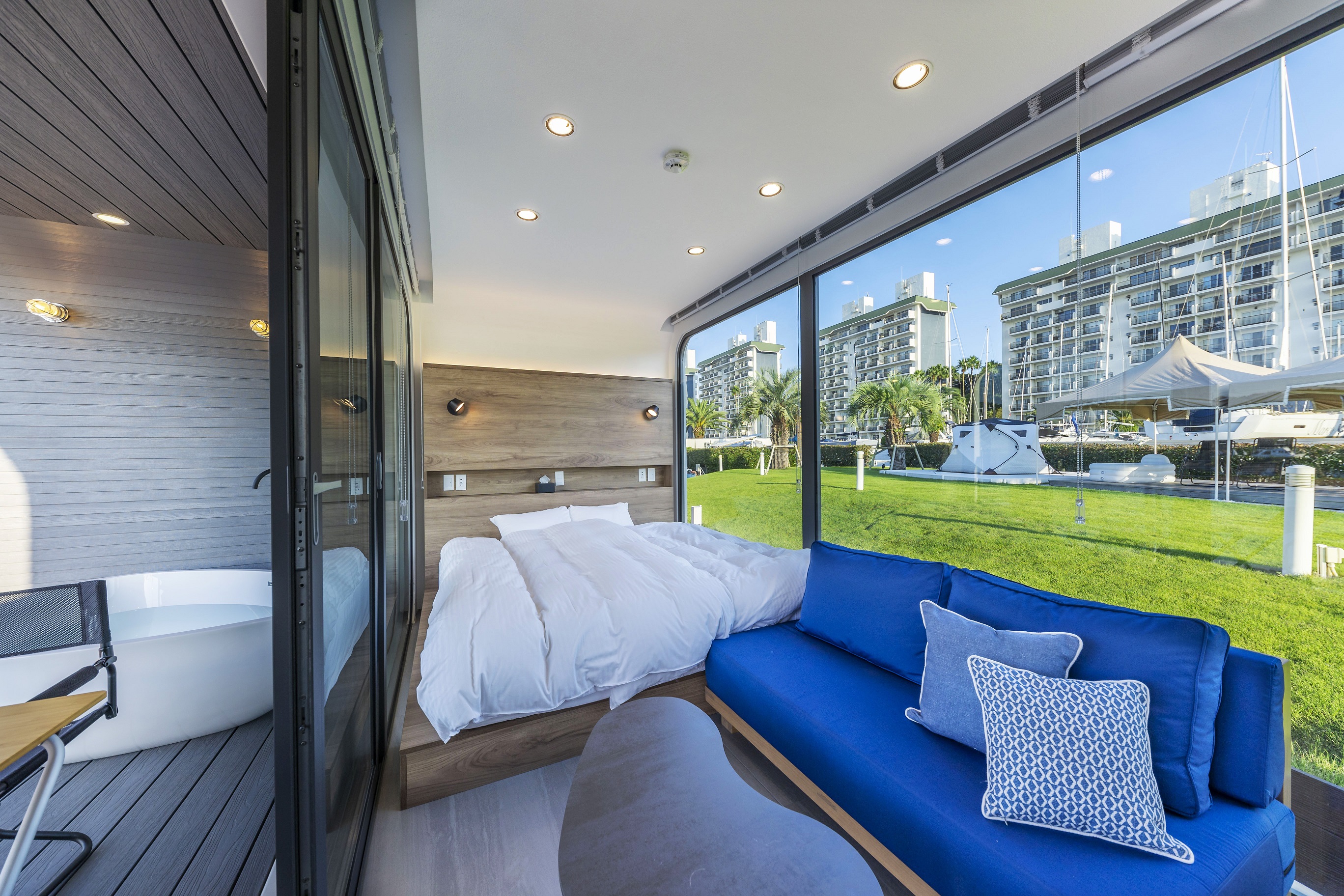 ヨットやボートに囲まれたマリーナの中に設置されたSPACE(客室)は、一面ガラス窓で全棟オーシャンビュー。