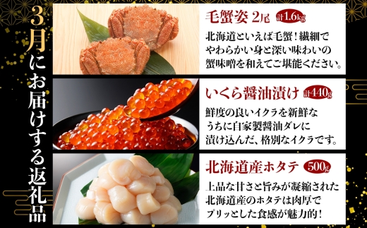 3月 毛蟹800g×2、いくら醤油漬け220g×2、ホタテ玉冷500g