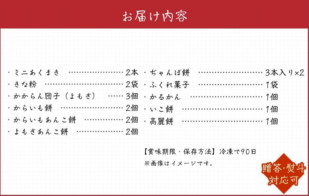 からいもあんこ餅:餅米(国内産)、さつま芋(南九州市産)、小豆(北海道産)、上白糖、きな粉(大豆)、塩