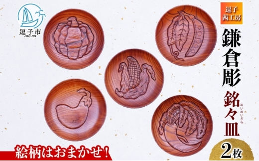 鎌倉彫 銘々皿 2枚セット 手作り 皿 工芸品 木製 お茶 お茶菓子 絵柄 おまかせ 彫刻 拭き漆塗り 欅 けやき ケヤキ キッチン雑貨 ファミリー 来客用 取り皿 カフェ風食器 取り皿 プレゼント 茜工房 送料無料 神奈川県 逗子市[№5875-0852]