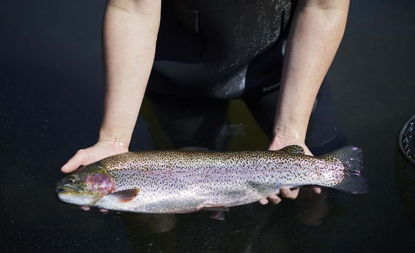 岩手県陸前高田市生出(おいで)地区の湧水で育った「岩姫サーモン」。岩手の名水二十選「清水の湧口(しずのわっくつ)」を使用し、卵から親まで育てる完全養殖を行っています。