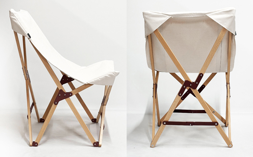 長さの異なる細長い天然木の角材を金属プレートで巧みに結合し、支え合うことで、瞬時に折りたたむことができるため、持ち運びに適した構造です。