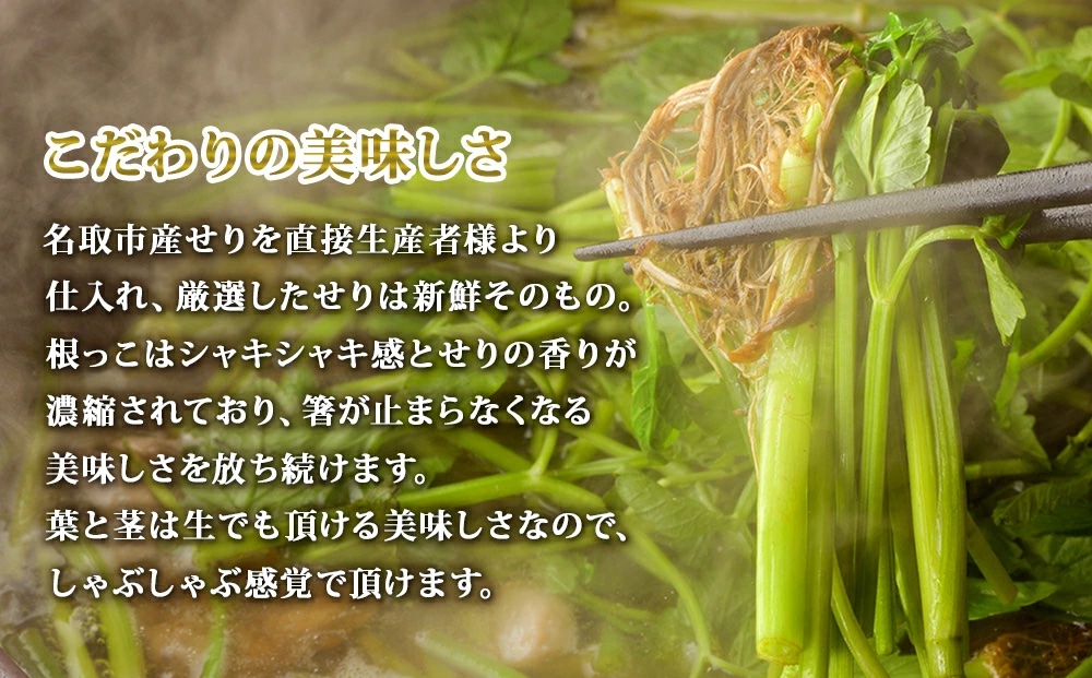 美しい伏流水に育まれた名取のせりは、四季を通じて味わい方が移りゆきますが、特に冬場のせりは、根・茎・葉のすべてを味わうことができるご馳走になります。「名取せり鍋」は各地の鍋まつりで数々の栄冠に輝きました。