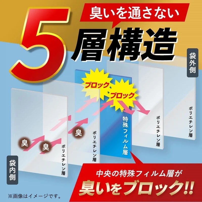 フィルムメーカーならでは! 袋は5層構造になっており、中央にある特殊フィルム層が臭いをブロックします。