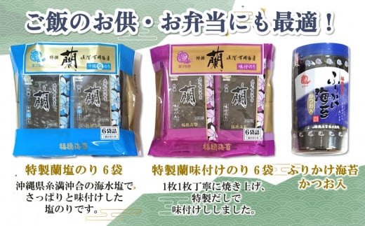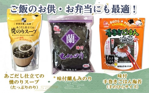 その他に、味付手巻きごはん海苔(手のひらサイズ)、味付蘭もみのり、ふりかけ海苔かつお入り、