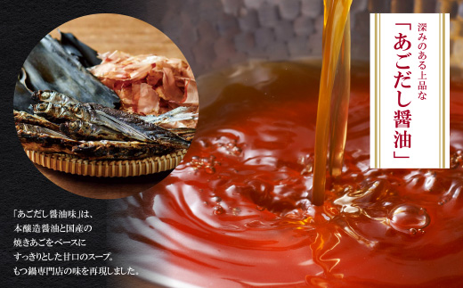 本醸造醤油と国産の焼きあごを使用したスープはすっきりとして上品な味わい。もつと具材の美味しさを引き立てます。