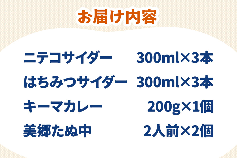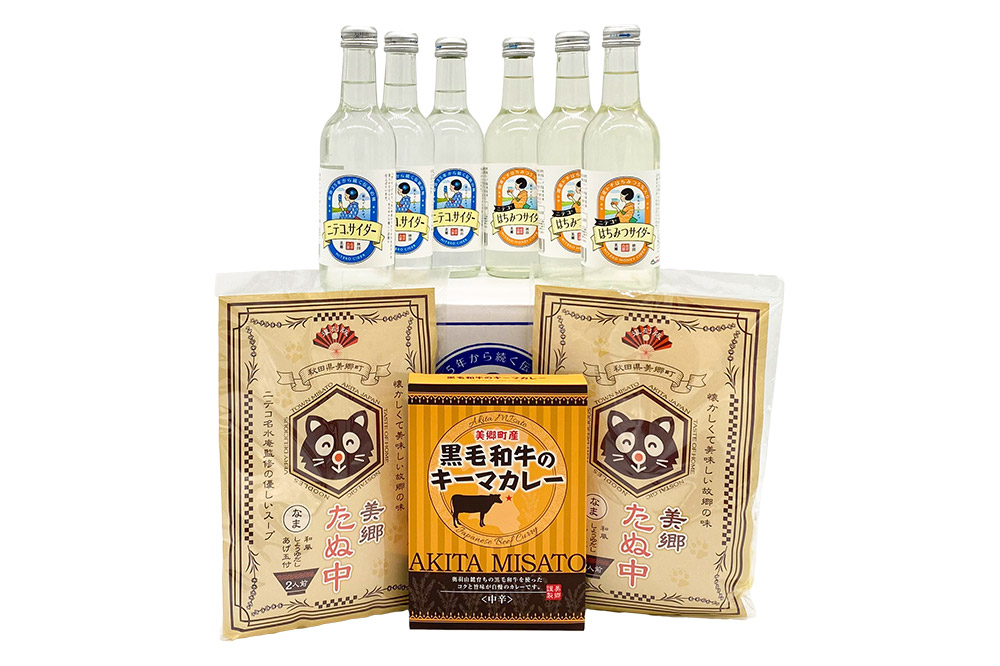 秋田県美郷町の豊かな水源と良質な水質の水を使用したニテコサイダーとはちみつサイダー、美郷ご当地グルメ「美郷たぬ中」と「美郷黒毛和牛のキーマカレー」をセットにしてみました。