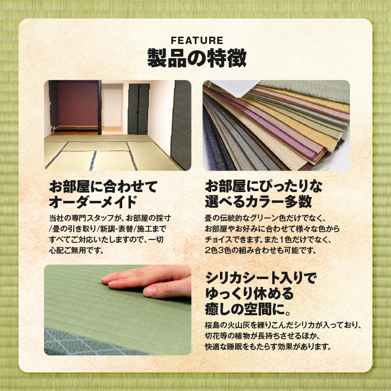 シリカ畳新調特徴は桜島の火山灰を練りこんだシリカがシリカ畳1帖サイズには入っており、切花等の植物が長持ちをする特徴があります。