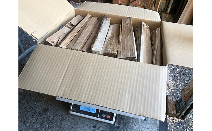 そんな「こだわりの薪」を段ボール箱(45cm×33cm×36cm)の箱に約18キロ(乾燥具合・木材の比重により個体差あり)量としては大体みかんの収穫箱1杯分位でご用意いたしました。