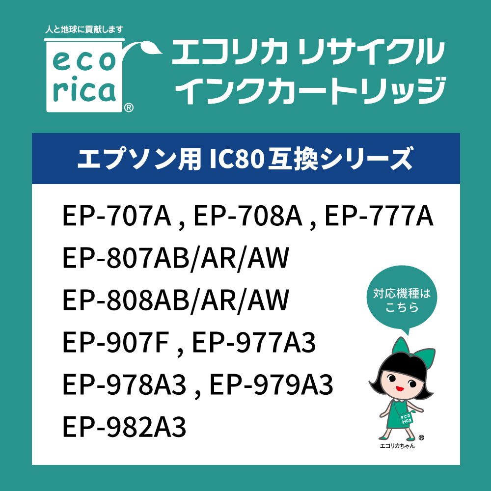 エコリカリサイクルインクカートリッジは使用済みインクカートリッジを全国に設置している「エコリカ回収BOX」で回収しリユース(再使用)製品として再生した環境にやさしい製品です。