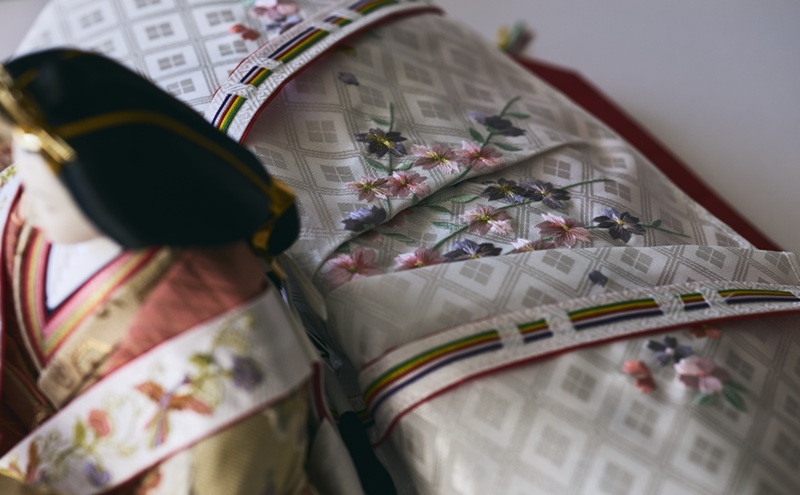 ひな人形にしてみたい着物・帯地をお送り又はご持参いただければ、担当スタッフとの打ち合わせの上人形の着物に仕立て上げます。