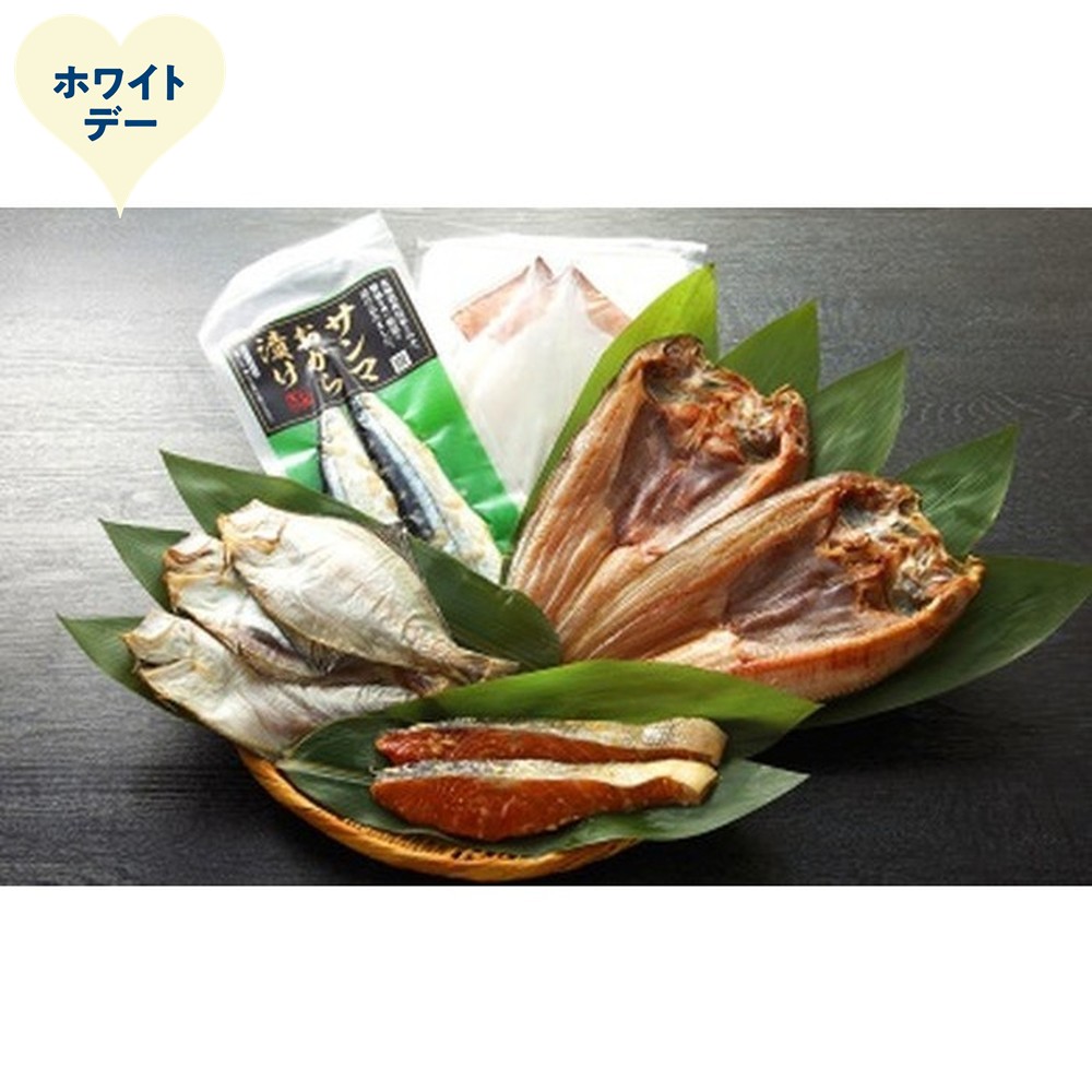 一夜干し真ほっけ開き(230~300g)2枚、一夜干しイカ開き2枚、一夜干し宗八かれい3枚、サンマおから漬け 2入、鮭西京風切身2切