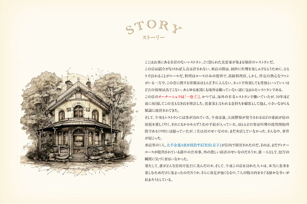 山奥に佇む秘密のレストランを舞台に、一皿の料理が運ばれた瞬間に一人の客が命を落とすーー。そこから物語が始まるクラシカルなミステリーです。