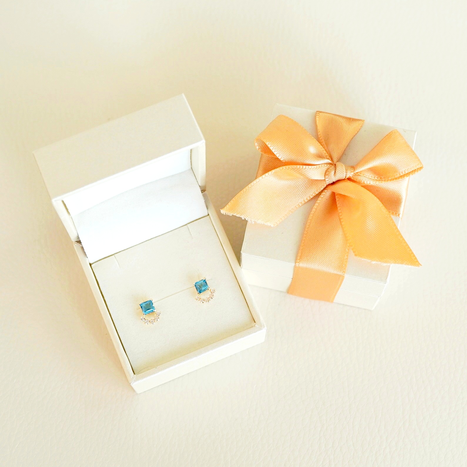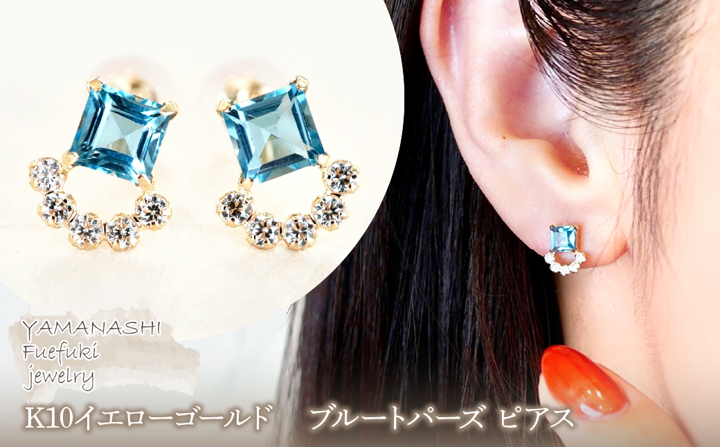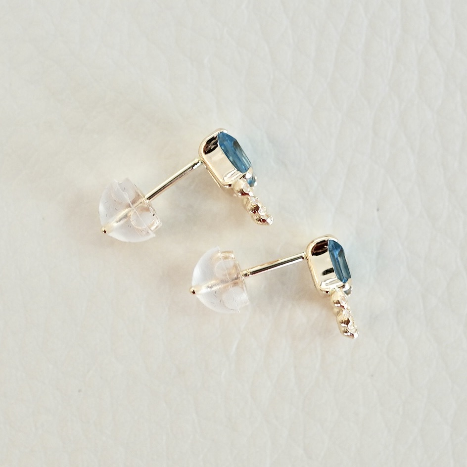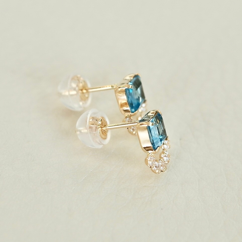 スクエアカットのブルートパーズをエレガントに仕上げたピアスです。
