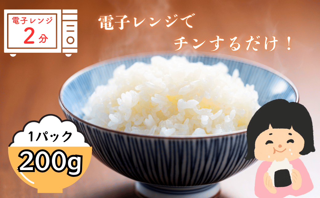 ご飯を炊くのが面倒なとき、忙しくて時間がなかったり、ご飯が少し足りない時など、手軽にレンジで2分温めていただくだけでお召し上がりいただけます。