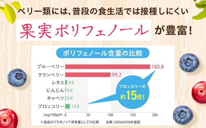 1.約4000種類もあるポリフェノールの中でも優れた成分をもつベリー類に着目。それぞれに特長を持つ複数のポリフェノールを摂取することにより、美容や健康づくりのための様々な働きが期待できます。