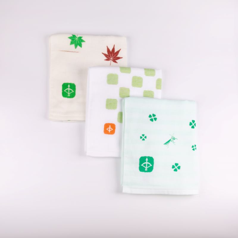 片面ガーゼ、片面パイルのフェイスタオルです。ガーゼ面にプリントを施しています。泉州タオルの特徴である吸水性はもちろん、ガーゼ面・パイル面の2層仕上げで乾きも早いです。原料の綿糸は国内の紡績工場で作られたものを100%使用するJAPAN madeです。小さな町工場で作っています。