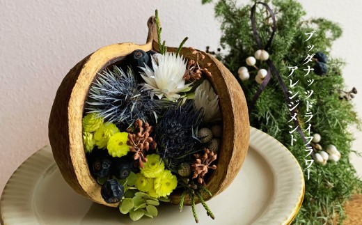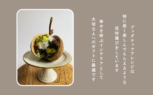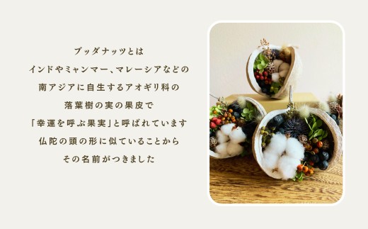 「ブッダナッツ」にドライフラワーをアレンジしたこの商品は、幸せを呼ぶインテリアとしておすすめです。