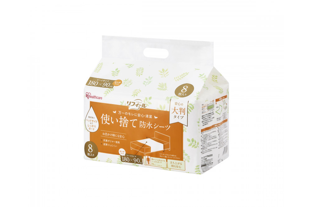 気軽に使える使い捨てタイプの防水シーツです。安心の大判タイプです。吸水力が高く、逆戻りしにくくなっています。吸収体がベッドサイドまでしっかりガードします。シーツ内部は抗菌ポリマーを使用しています。おむつからの横漏れやおむつ交換時、足浴などで寝具が汚れるのを防ぎます。立ち上がる時も安心です。また旅行先や外泊時もお使いいただけます。縦、横どちらの向きでもお使いいただけます。
