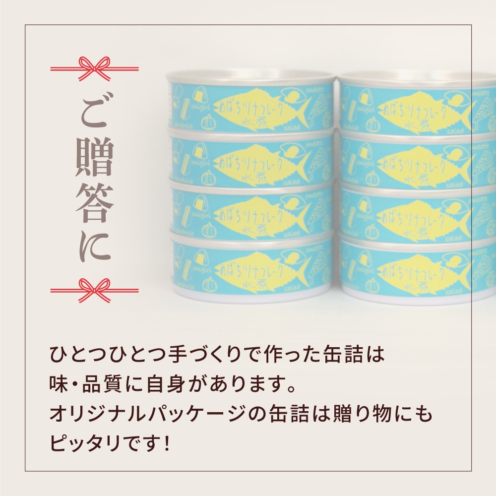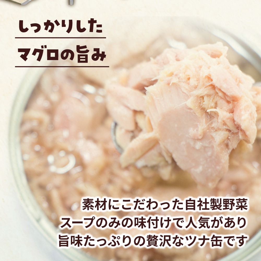 鮮度抜群のメバチマグロを加熱後に手作業で身をほぐし、缶詰にしました。野菜スープのみの味付けでマグロの味をしっかりと感じられる缶詰になっています。